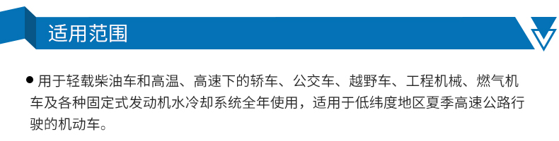 ●用于轻载柴油车和高温、高速下的轿车、公交车、越野车、工程机械、燃气机车及各种固定式发动机水冷却系统全年使用。适用于低纬度地区夏季高速公路行的机动车。