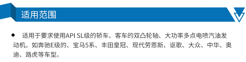适用于要求使用API SL级的轿车、客车的双凸轮轴、大功率多点电喷汽油发动机。如奔驰E级的、宝马5系、丰田皇冠、现代劳恩斯、讴歌、大众、中华、奥迪、路虎等车型。