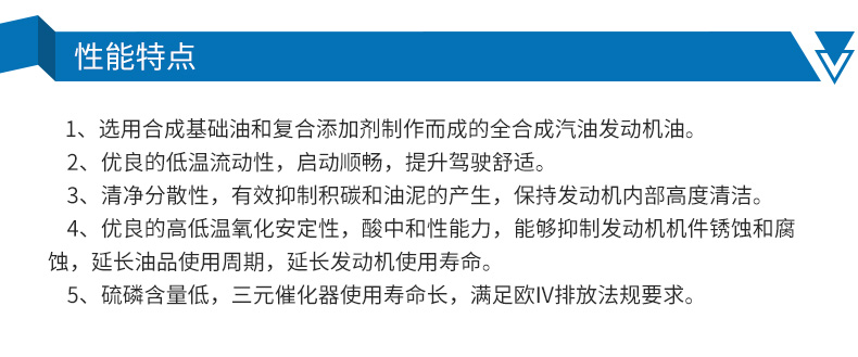 ●选用进口合成基础油和进口复合添加剂精制而成的全合成汽油发动机油。优异的低温流动性,启动顺畅,提升驾驶舒适。清净分散性,有效抑制积碳和油泥的产生,保持发动机内部高度清洁。硫磷含量低,三元催化器使用寿命长,满足欧Ⅳ排放法规要求。