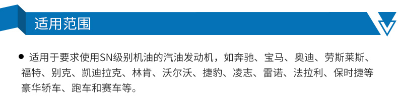 ●适用于要求使用SN级别机油的汽油发动机,如奔驰、宝马、奥迪、劳斯莱斯、福特、别克、凯迪拉克、林肯、沃尔沃、捷豹、凌志、雷诺、法拉利、保时捷等豪华轿车、跑车和赛车等。